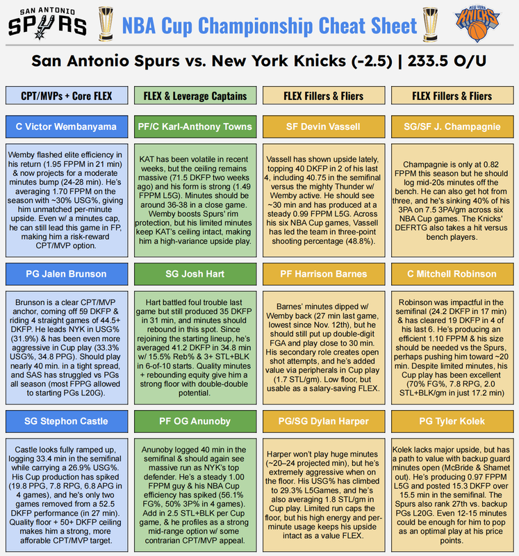 - LineStar's NBA Cup Championship Cheat Sheet | Spurs vs. Knicks! 🏆