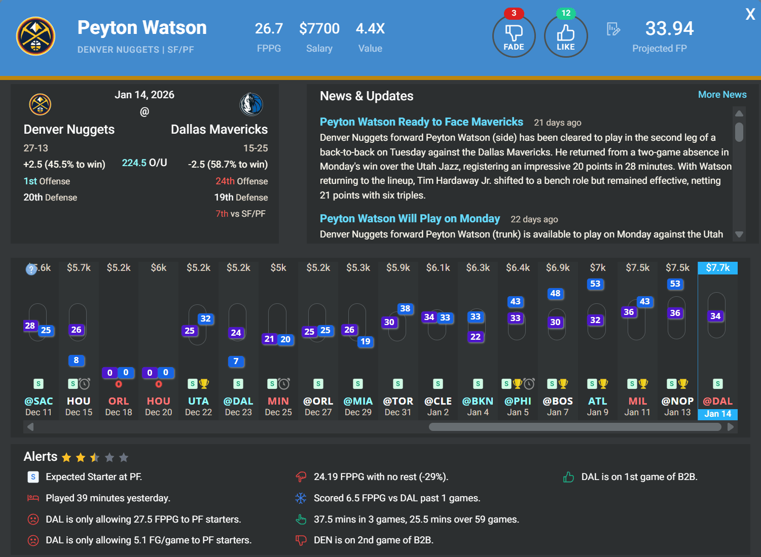 SF/PF Peyton Watson, DEN | DK: $7.7k, FD: $7.7k | at DAL