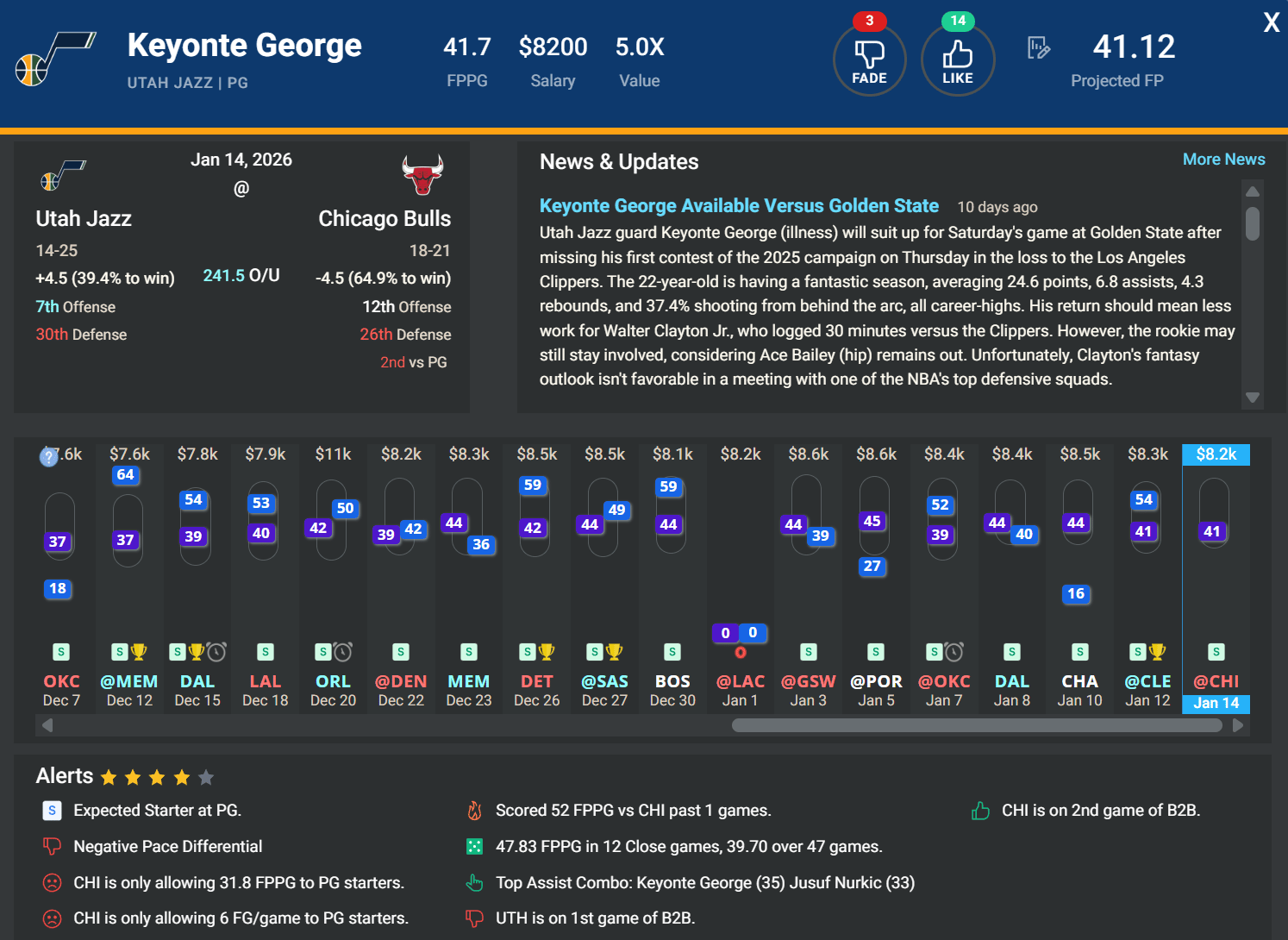 PG Keyonte George, UTA | DK: $8.2k, FD: $8.4k | at CHI