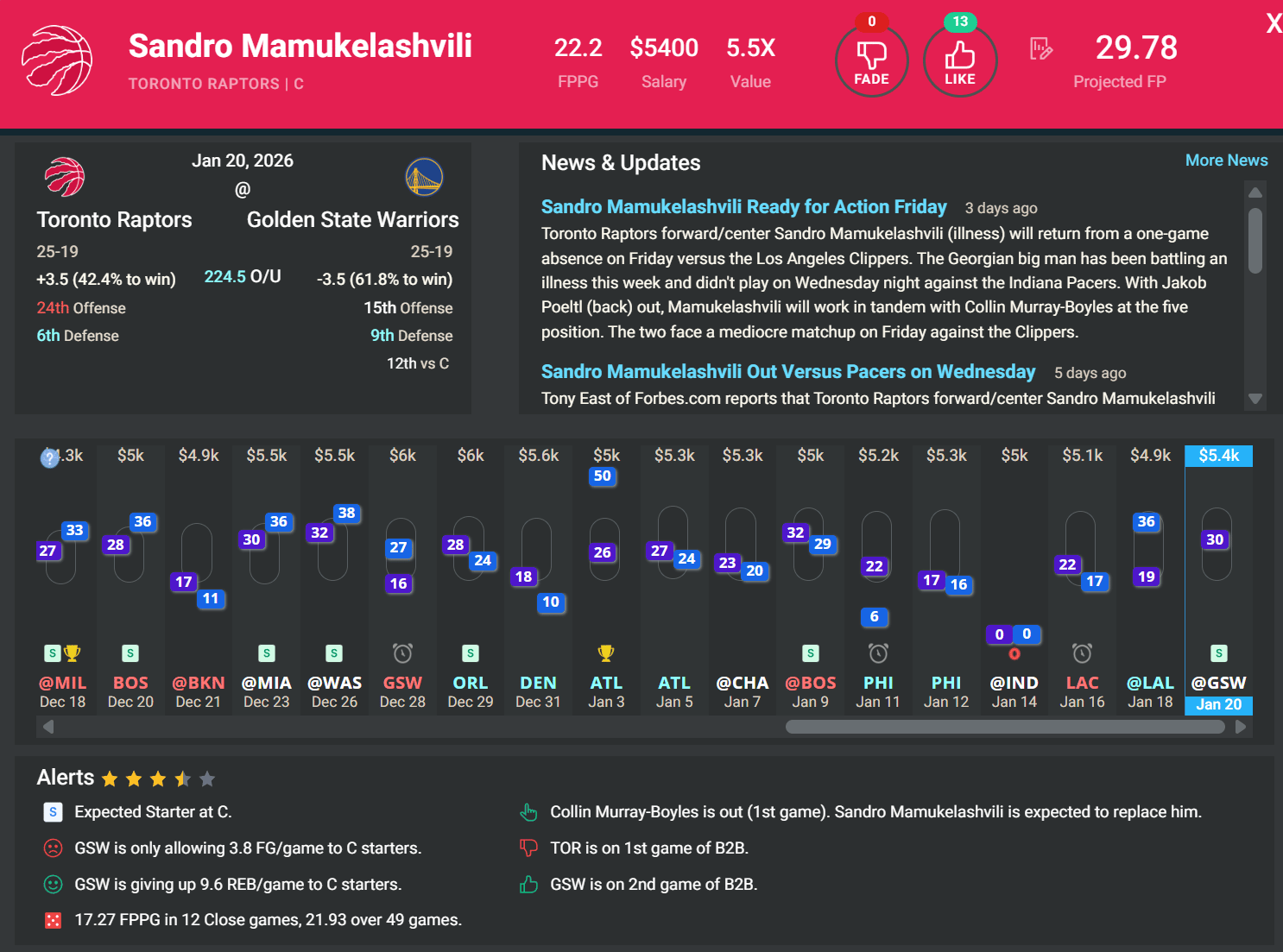 C Sandro Mamukelashvili, TOR | DK: $5.4k, FD: $5.2k | at GSW