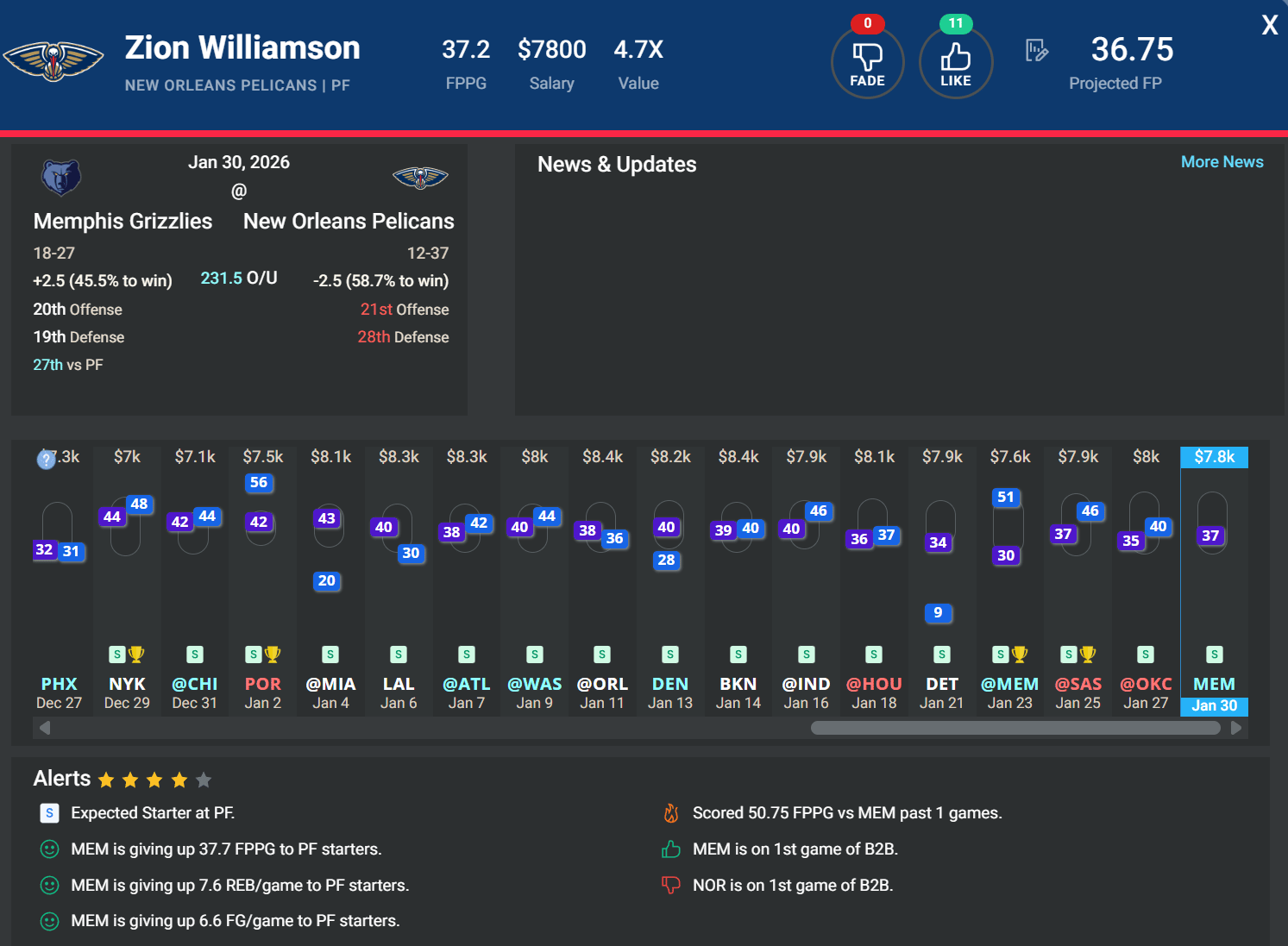 When Zion Williamson is healthy and seeing real minutes, his fantasy profile becomes extremely hard to ignore – especially at these price points. Over his last 20 games, he’s averaged a strong 1.25 FPPM, and his workload has finally started to trend in the right direction. After being managed for much of the season, Zion has logged at least 33 minutes in three straight games. The matchup only sweetens the deal. Memphis has been a complete sieve against power forwards, allowing the most FPPG to starting PFs over their last 20 games. Zion has already faced the Grizzlies three times this season and has topped 50.75 DKFP in two of those meetings. At just $7.8k on DraftKings and $8.2k on FanDuel, Zion stands out as one of the better point-per-dollar ceiling plays among upper-tier forwards and is firmly in play if you’re looking to spend up at the position without paying true top-end salaries.