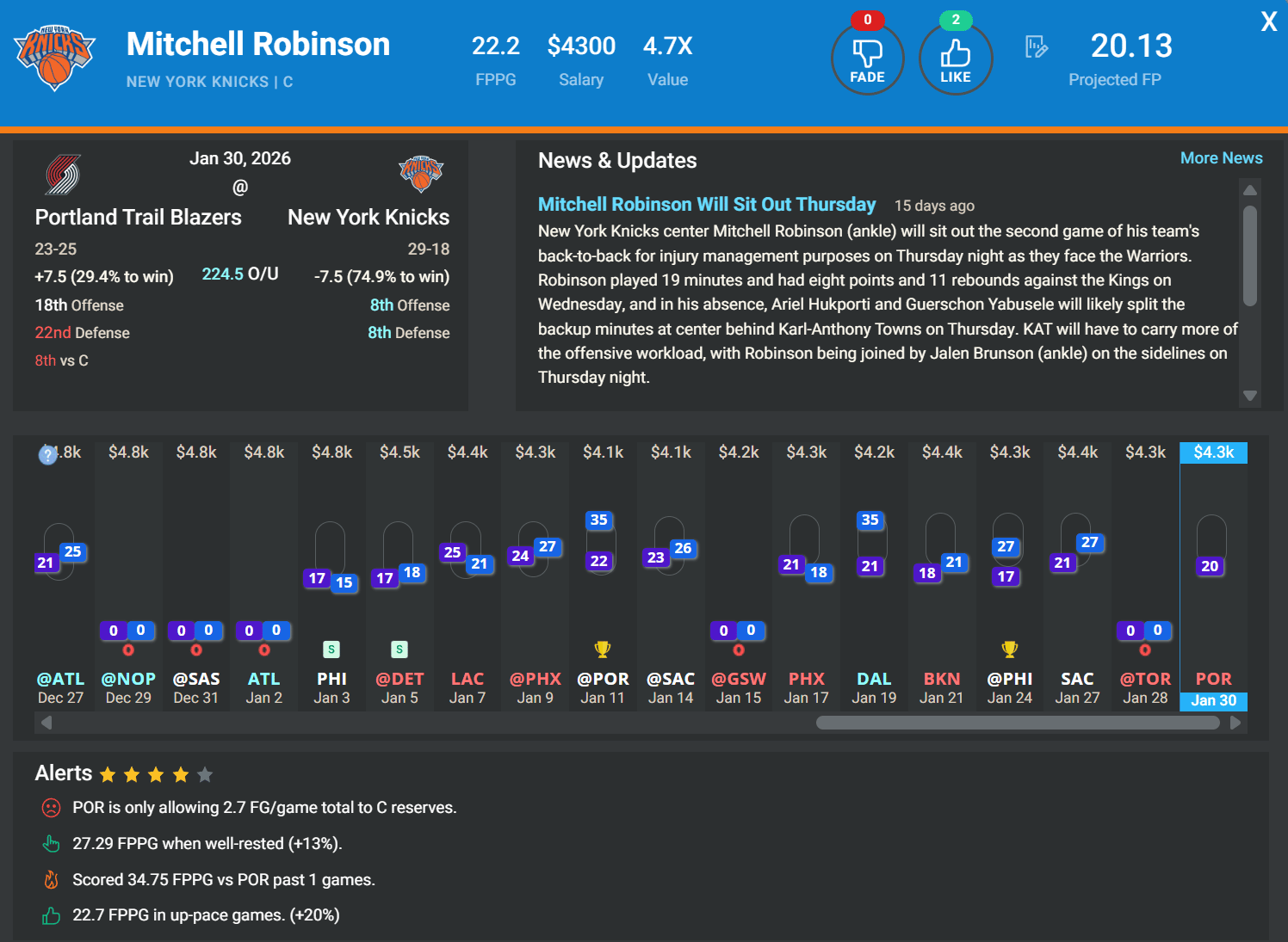 C Mitchell Robinson, NYK | DK: $4.3k, FD: $4.5k | vs. POR