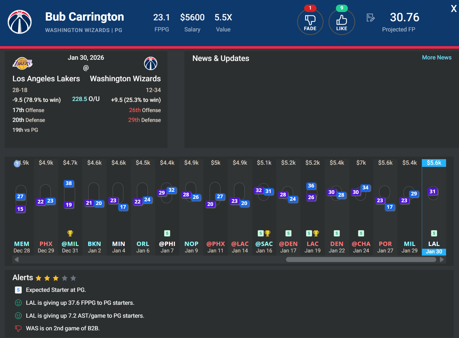 PG Bub Carrington, WAS | DK: $5.6k, FD: $5.2k | vs. LAL
