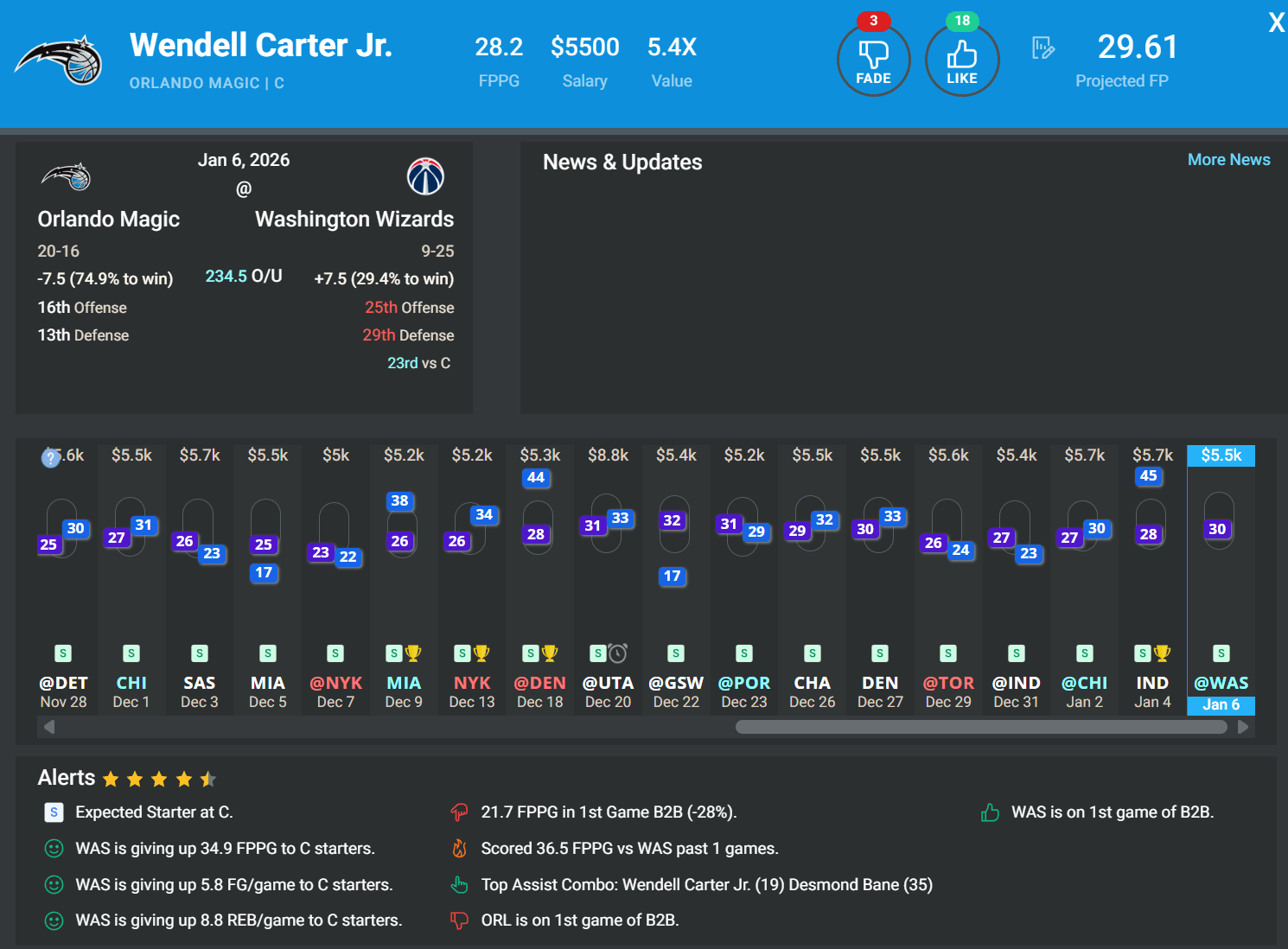 Victor Wembanyama is the only stud center available today, and he’s officially questionable – even if he does play, he’s likely going to be capped at around 24 minutes. So, we don’t need to force a pricey guy in here and Wendell Carter Jr. makes a ton of sense at these mid-$5k salaries. WCJ continues to benefit from an expanded role with Franz Wagner and Jalen Suggs sidelined, and his minutes have stabilized in the low-30s recently. He’s already shown upside in this matchup, posting 37.5 DKFP against Washington earlier this season in just 28 minutes. The Wizards play fast and struggle defensively, particularly in the interior where they rank dead last in DvP versus starting centers. The combination of minutes security and matchup makes Carter one of the most reliable center options on the slate.