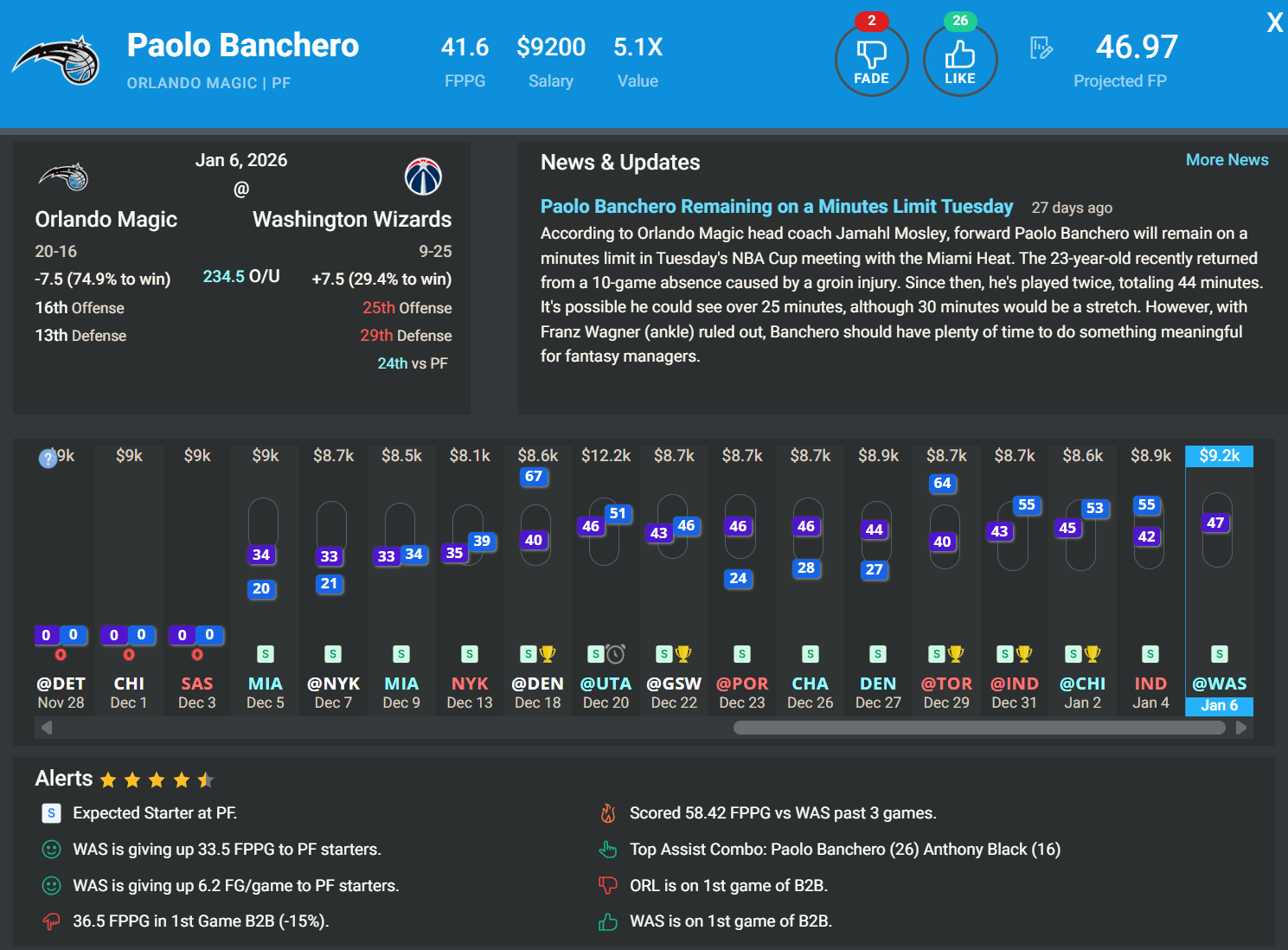 Paolo Banchero has looked much more like himself lately, posting at least 53.0 DKFP in four straight games while averaging an excellent 1.57 FPPM over that span. With Franz Wagner and Jalen Suggs both sidelined, Banchero’s usage climbs to 29.2%, and the offense continues to run through him. This is a strong matchup against a Wizards team that plays fast and ranks near the bottom of the league defensively, and Banchero has averaged 58.4 DKFP/gm in his last three meetings with Washington. The main concern is potential minute suppression with Orlando (-7.5) sitting as the heaviest favorite on the slate while playing on the front end of a back-to-back. However, they do have another very winnable game lined up tomorrow against the Nets, so they may not be too concerned about giving their starters their usual run even in a light blowout. Banchero profiles better on DraftKings, where the price hasn’t fully caught up to the recent production, unlike how it has on FanDuel.