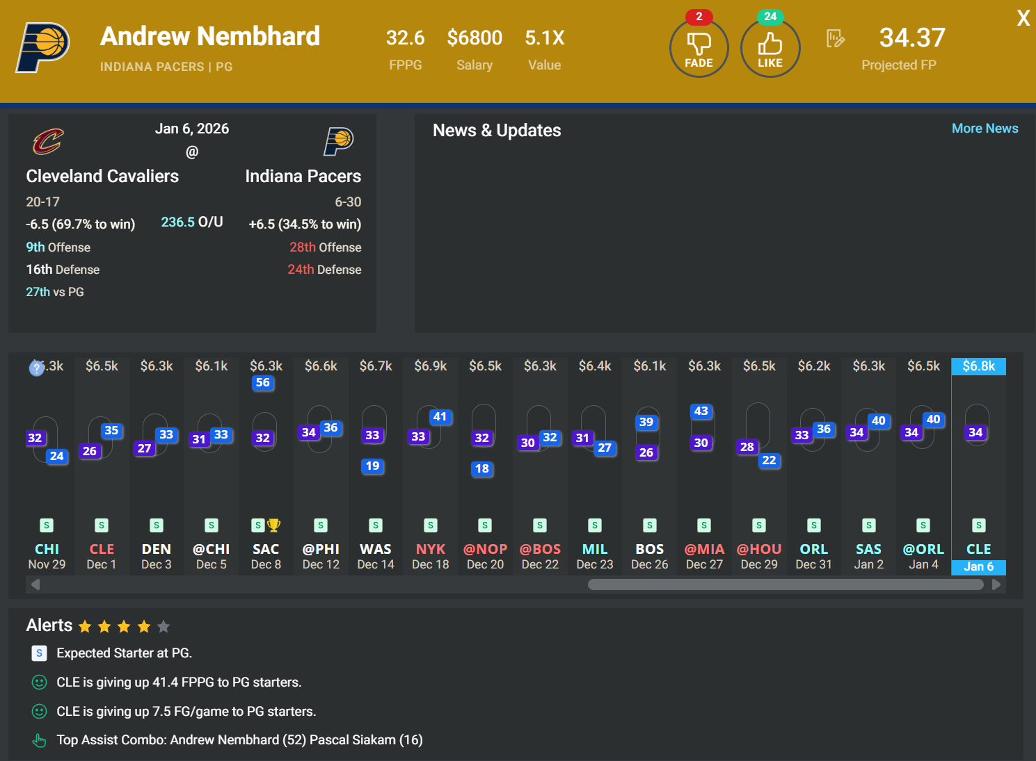 PG Andrew Nembhard, IND | DK: $6.8k, FD: $6.9k | vs. CLE