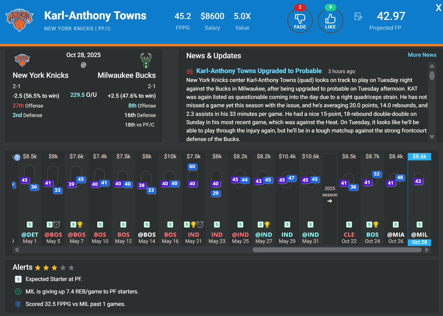 PF/C Karl-Anthony Towns, NYK | DK: $8.6k, FD: $8.3k | at MIL