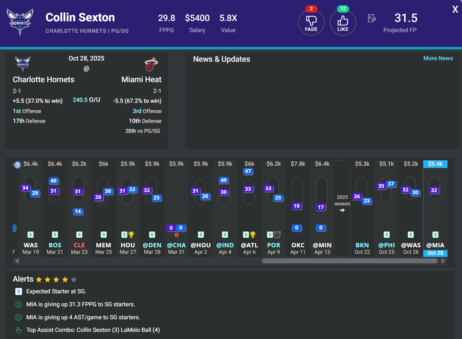 Sexton was a solid, somewhat under-the-radar offseason pickup for the Hornets, acquired back in June in the deal that sent center Jusuf Nurkic to the Jazz. He has started in each of the last two games and should continue to do so, especially with Brandon Miller (shoulder/out) currently sidelined. Sexton has played 30+ minutes and scored 20+ points in both starts, and he has been an efficient shooter, sinking 56.3% of his attempts. He doesn’t put up a ton of threes (2.7 3PA/gm), but he has also made 50% of those shots from deep. Sexton has historically been a rock-solid FPPM producer, and he’s at a 1.10 FPPM so far this season. Given the high combined pace of this matchup, which we hit on in the LaMelo Ball spotlight above, Sexton should continue to have ample opportunity to put up another quality stat line tonight, and he feels just a bit too cheap at these mid-$5k salaries.