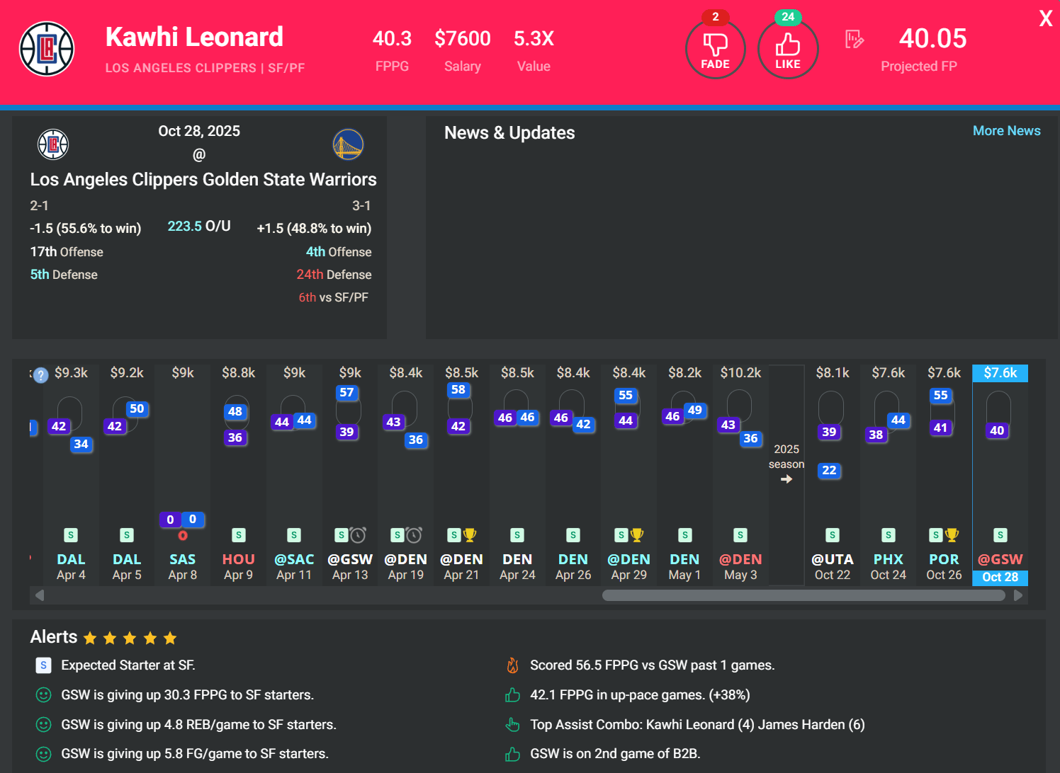 SF/PF Kawhi Leonard, LAC | DK: $7.6k, FD: $8.1k | at GSW