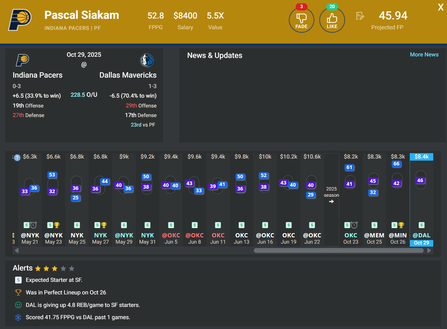 PF Pascal Siakam, IND | DK: $8.4k, FD: $9.2k | at DAL