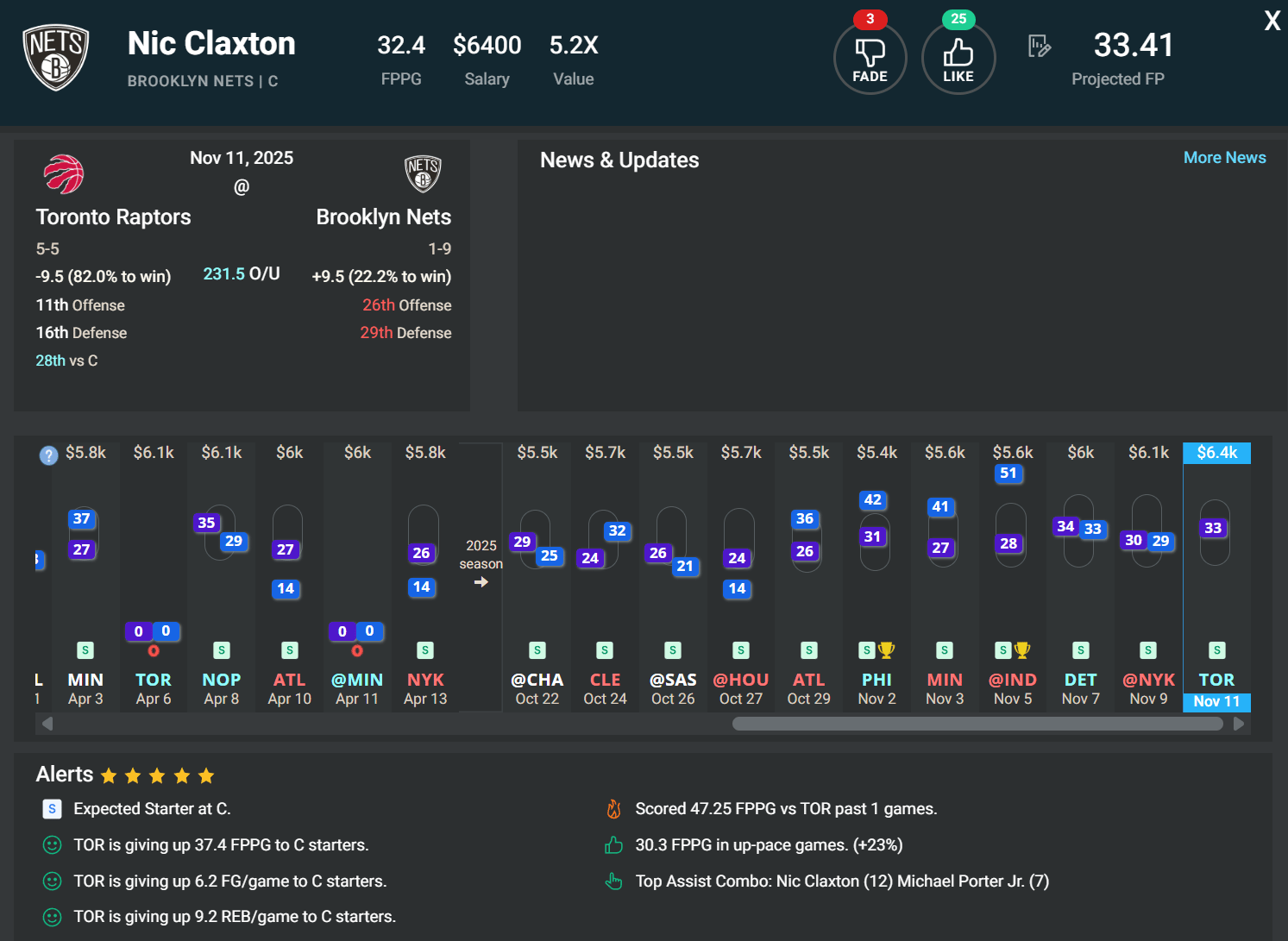 C Nic Claxton, BKN | DK: $6.4k, FD: $6.3k | vs. TOR