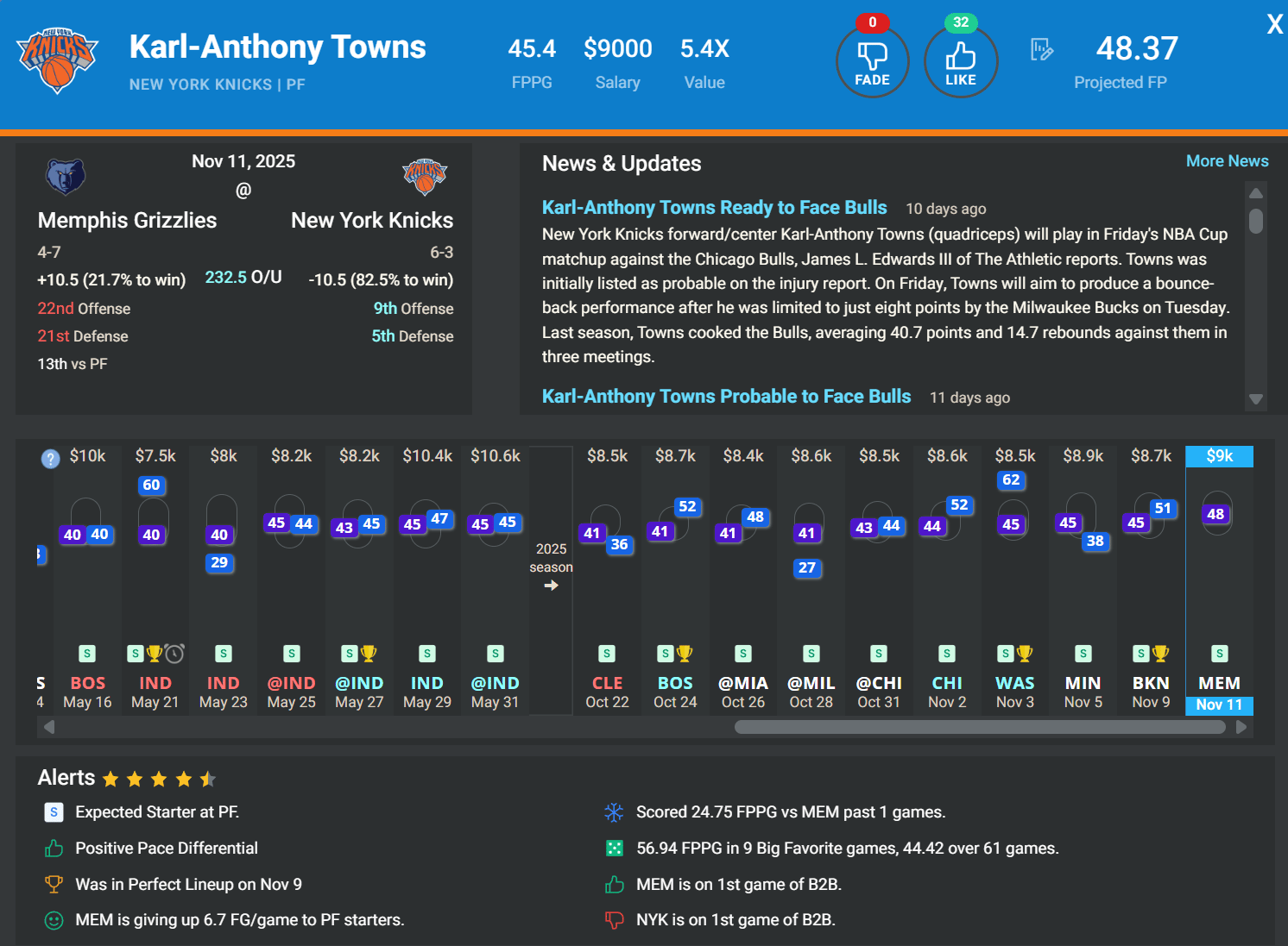 PF Karl-Anthony Towns, NYK | DK: $9k, FD: $8.5k | vs. MEM