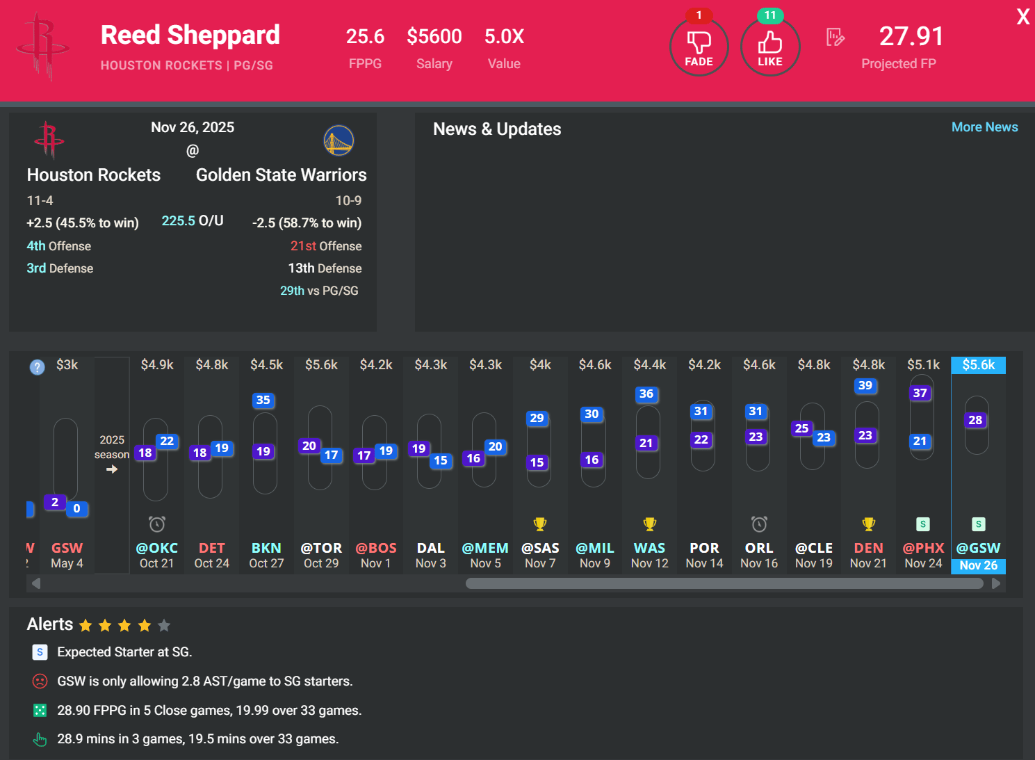PG/SG Reed Sheppard, HOU | DK: $5.6k, FD: $5.5k | at GSW