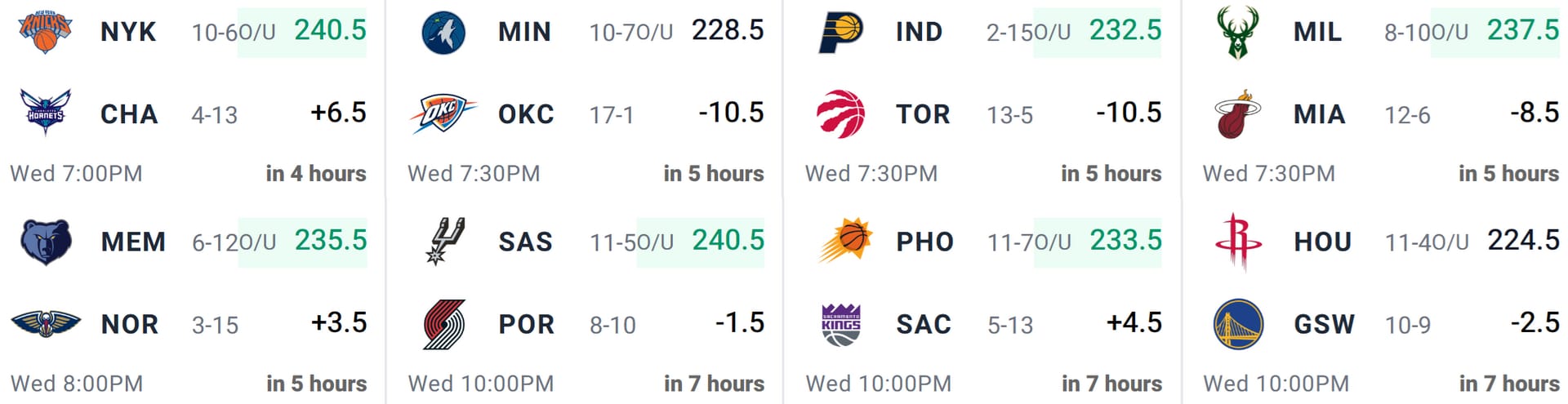 We’ve got an eight-game NBA Cup slate lined up for this Wednesday, and it’s a pretty intriguing midweek card. There are several strong scoring environments on the board, with NYK at CHA and SAS at POR both carrying totals north of 240 points, plus MEM at NOR at 235.5 and MIL at MIA at 237.5. The injury report isn’t complete chaos today, but there are still some big names carrying tags. Most teams have one or two key players listed as either out or questionable, so keeping an eye on news and starting lineups as they roll in will still be vital. Unlike a lot of previous slates, both DraftKings and FanDuel will feature 100% of the same matchups on their respective main slates, which is always a plus if you’re someone who plays on both sites. Let’s dig in and get set for this midweek NBA Cup slate. Best of luck! And I hope that everyone has a Happy Thanksgiving tomorrow! 🦃