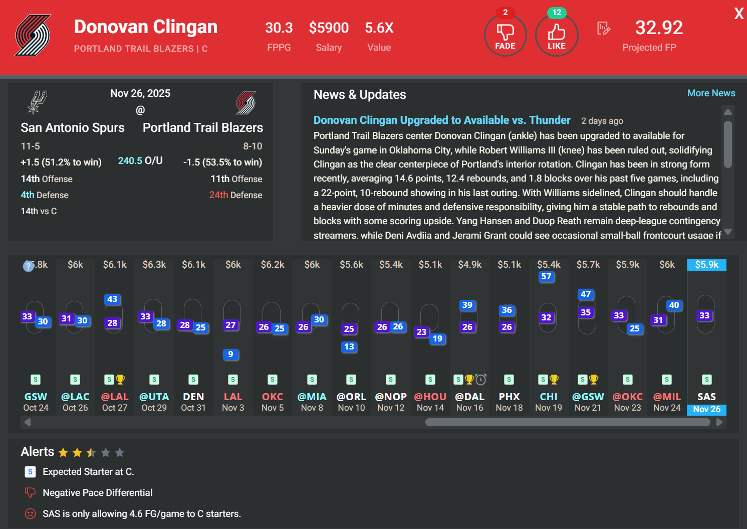 C Donovan Clingan, POR | DK: $5.9k, FD: $6.5k | vs. SAS