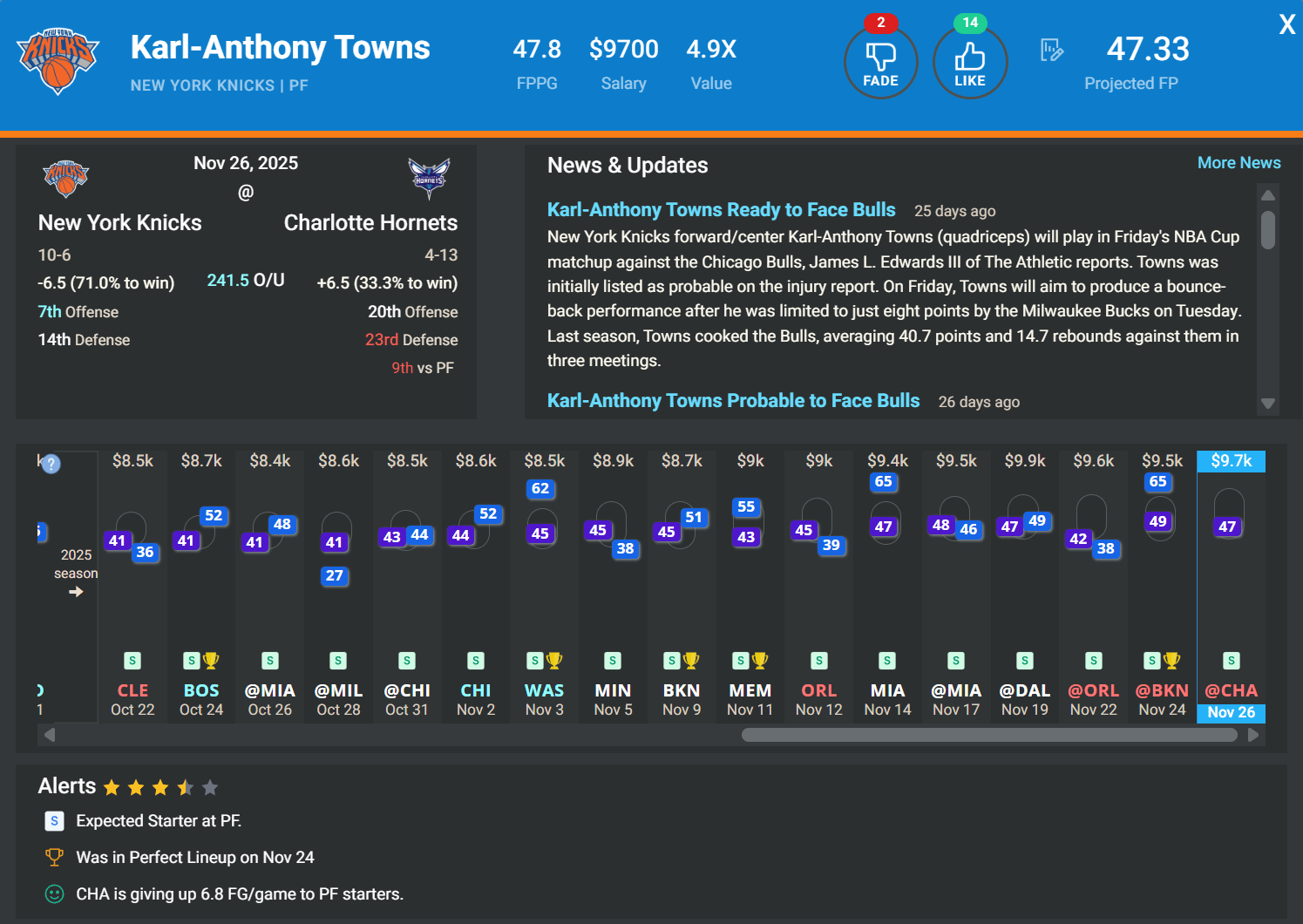 PF Karl-Anthony Towns, NYK | DK: $9.7k, FD: $9.6k | at CHA