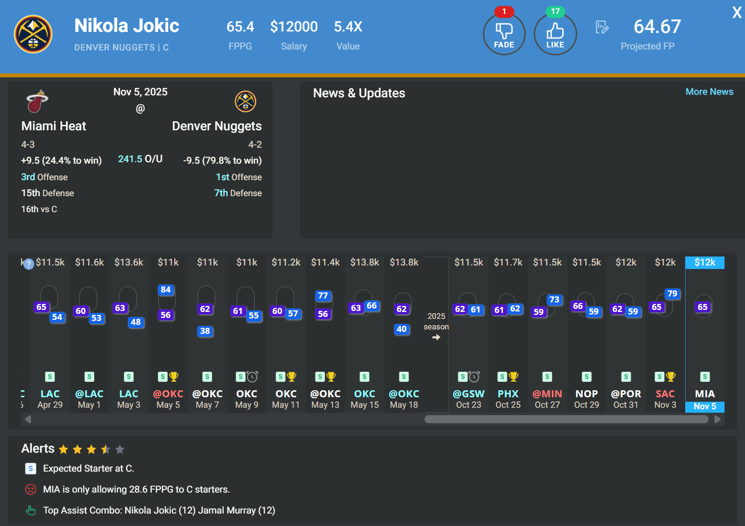 C Nikola Jokic, DEN | DK: $12k, FD: $12.3k | vs. MIA