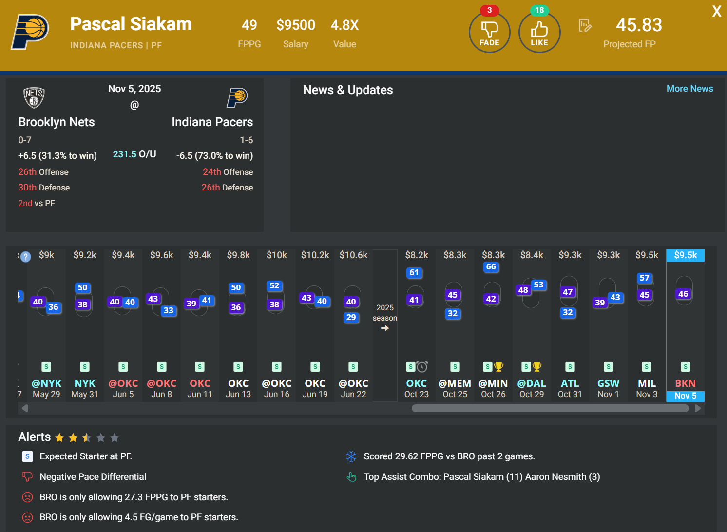 PF Pascal Siakam, IND | DK: $9.5k, FD: $9.6k | vs. BKN