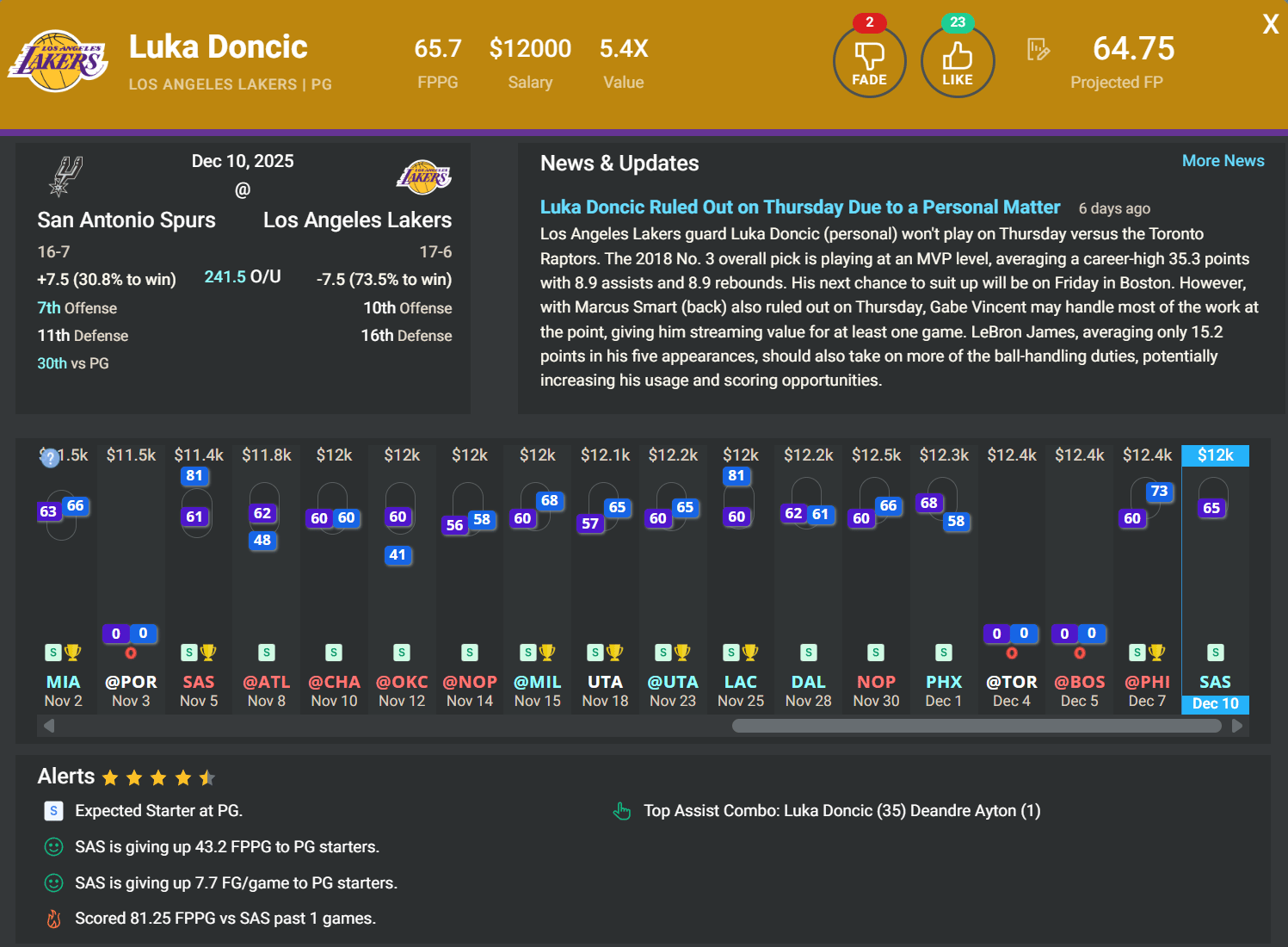 PG Luka Doncic, LAL | DK: $12k, FD: $12.4k | vs. SAS