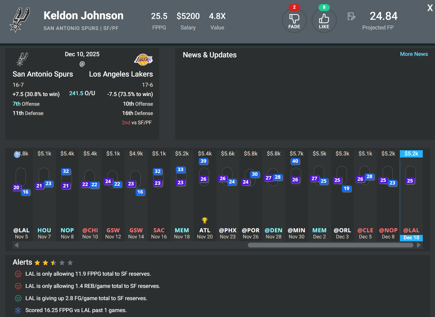 SF/PF Keldon Johnson, SAS | DK: $5.2k, FD: $5k | at LAL