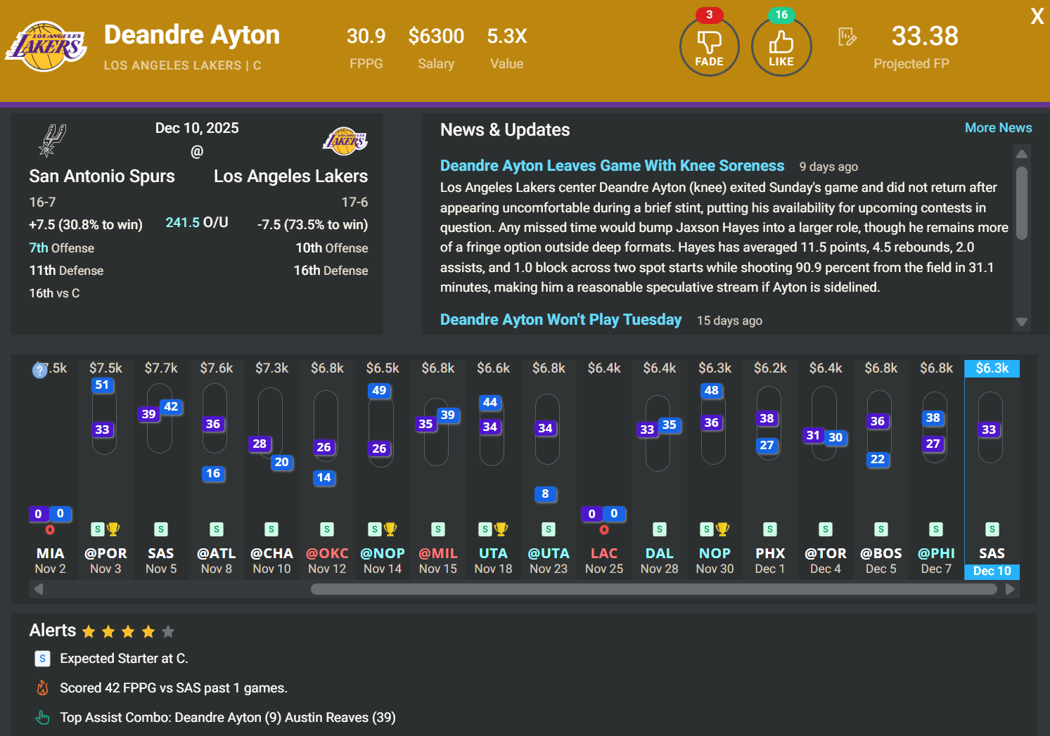 C Deandre Ayton, LAL | DK: $6.3k, FD: $6.1k | vs. SAS