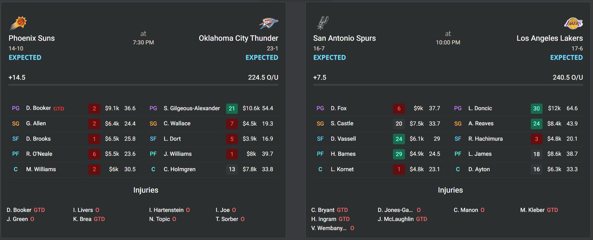 Outside of Booker, tonightās injury landscape is fairly light. The Thunder will be without Isaiah Hartenstein and Isaiah Joe, as they have been for the past several games, while the Spurs remain without Victor Wembanyama. The Lakers list Maxi Kleber as questionable, but his availability doesnāt impact much whatsoever, and they come in clean with their ābig threeā all available together for the seventh time this season. Letās dive into the plays. Best of luck!