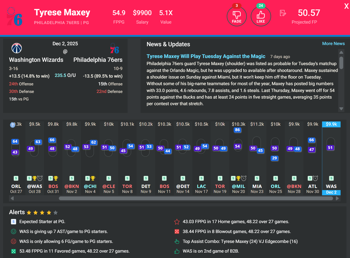 PG Tyrese Maxey, PHI | DK: $9.9k, FD: $10.4k | vs. WAS