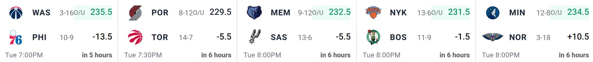 We’ve got a light one on tap tonight, with a five-game Tuesday slate on both DraftKings and FanDuel. Both sites are excluding the very late 11 pm ET Thunder–Warriors matchup, so all of our DFS attention stays focused on the early and mid-evening windows. Only five games, but there’s still plenty to work with, including a few fairly high-total games and a mix of competitive spots and at least one potential blowout with Philly currently sitting as 13.5-point home favorites over Washington.