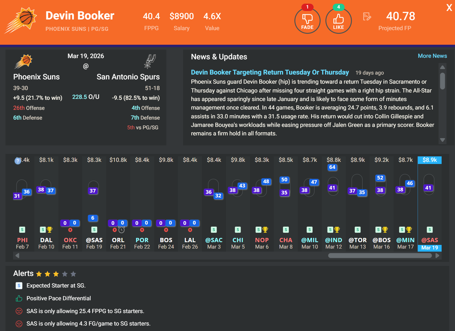 PG/SG Devin Booker, PHX | DK: $8.9k, FD: $8.9k | at SAS