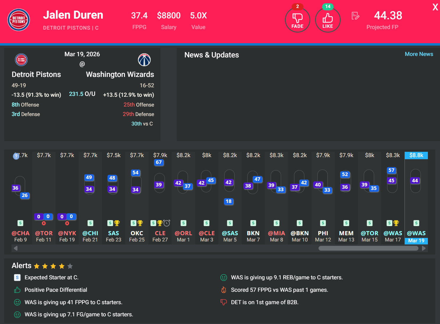C Jalen Duren, DET | DK: $8.8k, FD: $8.4k | at WAS