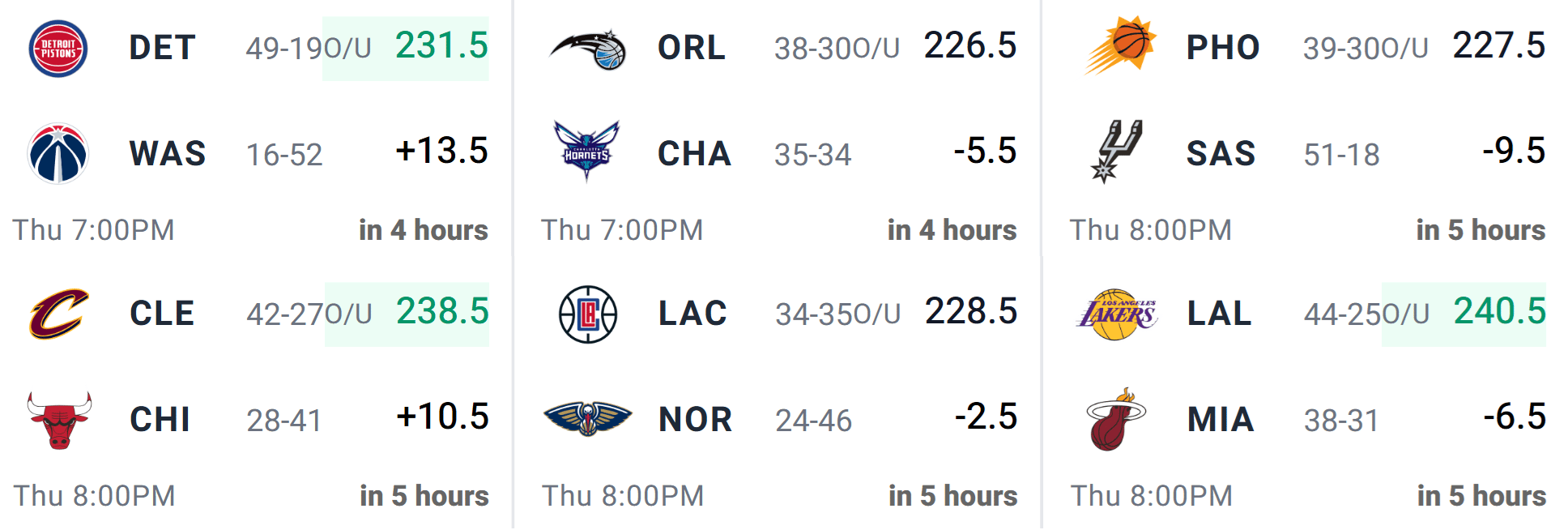 Main Slate Match-Ups w/ Game Totals & Point Spreads