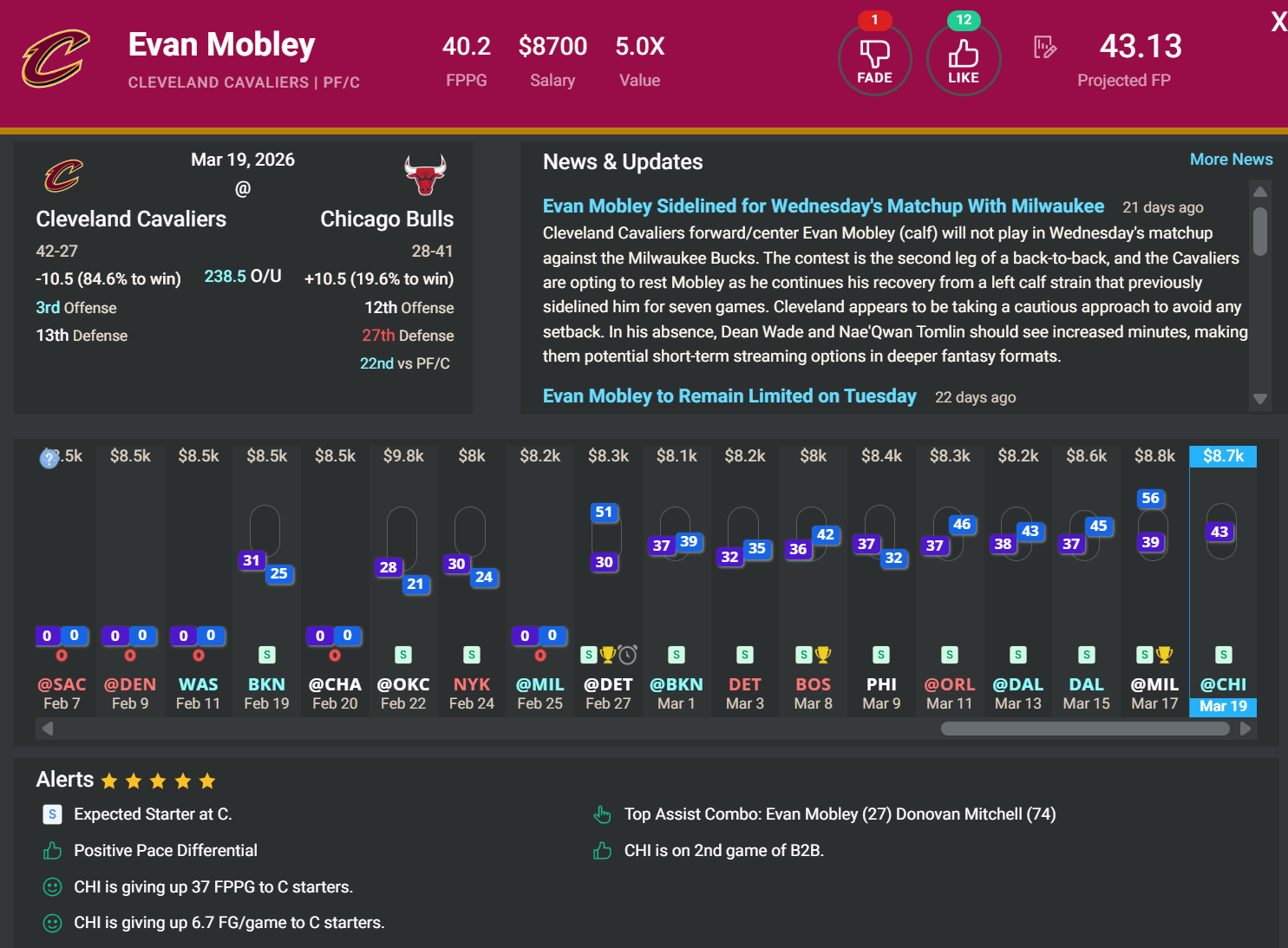 PF/C Evan Mobley, CLE | DK: $8.7k, FD: $9.1k | at CHI