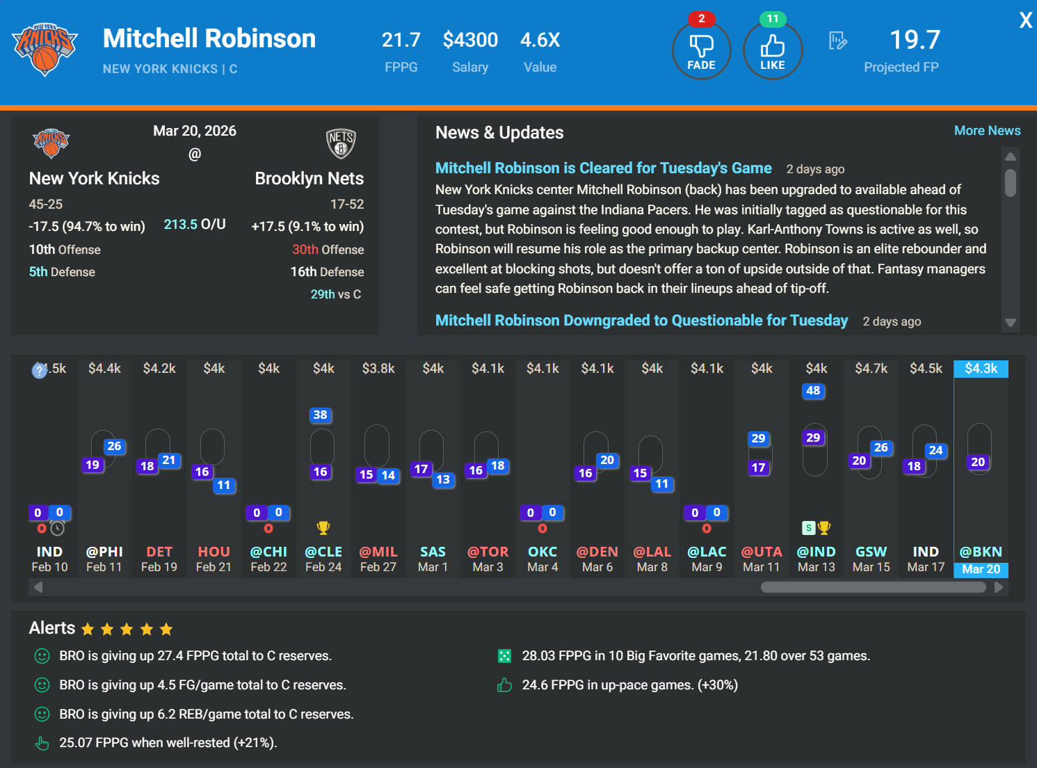 C Mitchell Robinson, NYK | DK: $4.3k, FD: $4.8k | at BKN
