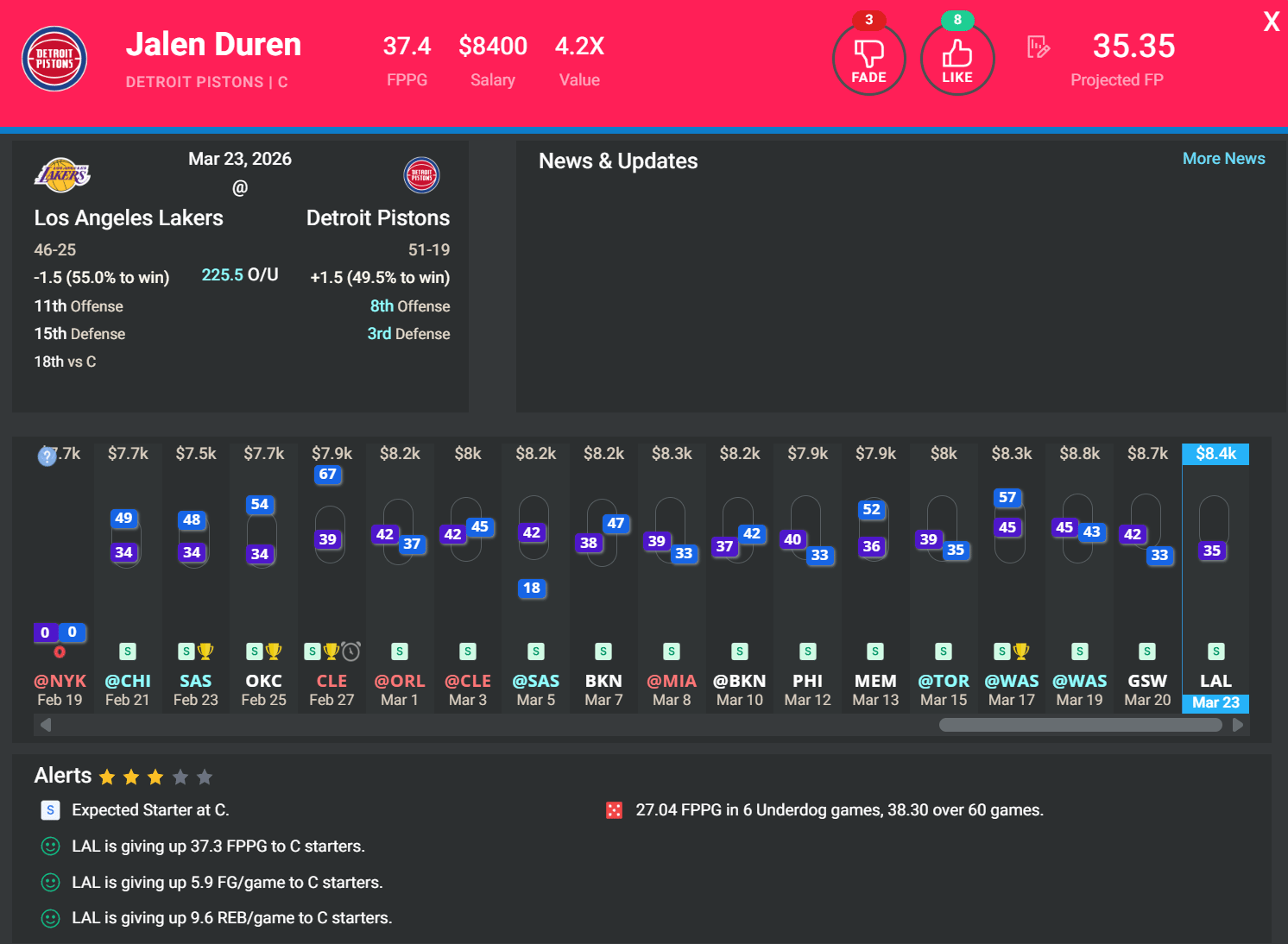 C Jalen Duren, DET | DK: $8.4k, FD: $8.7k | vs. LAL