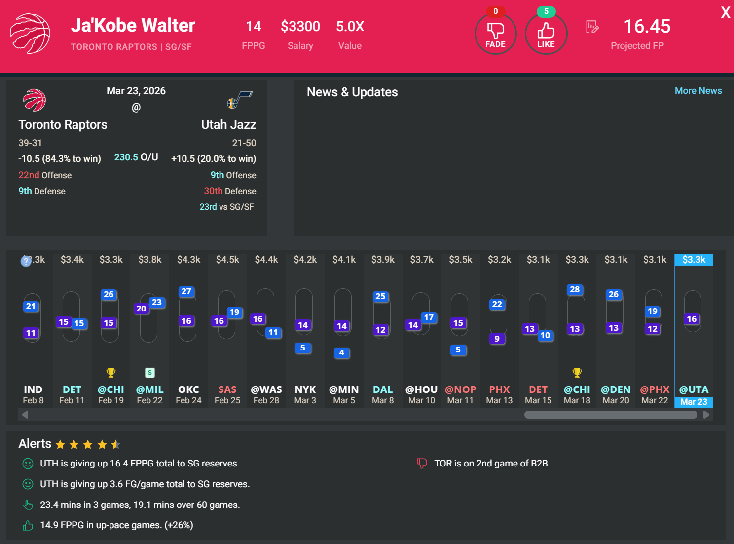 SF/SG Ja’Kobe Walter, TOR | DK: $3.3k, FD: $4.2k | at UTA