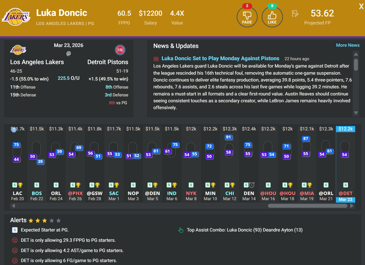 PG Luka Doncic, LAL | DK: $12.2k, FD: $12.8k | at DET