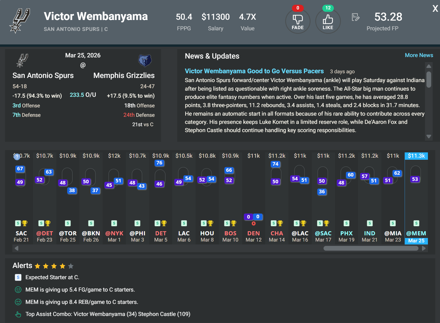 Blowout risk is the main concern here, but even in limited minutes, Wembanyama has shown he can deliver. When he was fresh off a brief injury absence, he posted 45.25 DKFP in just 21 minutes (2.15 FPPM) off the bench in this matchup earlier this season, highlighting how quickly he can rack up production. Memphis has also struggled against opposing centers, ranking 26th in DvP over their last 10 games. If he gets close to 30 minutes in this spot, it’s difficult to imagine he fails.