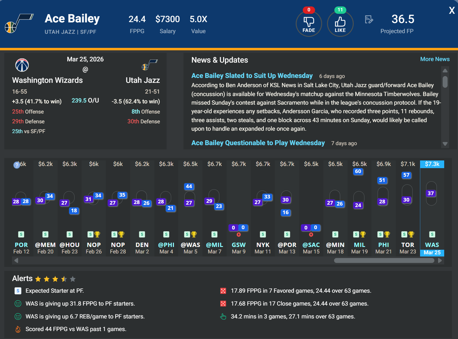 SF/PF Ace Bailey, UTA | DK: $7.3k, FD: $8.2k | vs. WAS