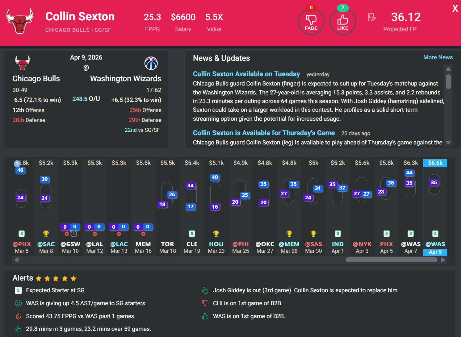SG/SF Collin Sexton, CHI | DK: $6.6k, FD: $7.2k | at WAS