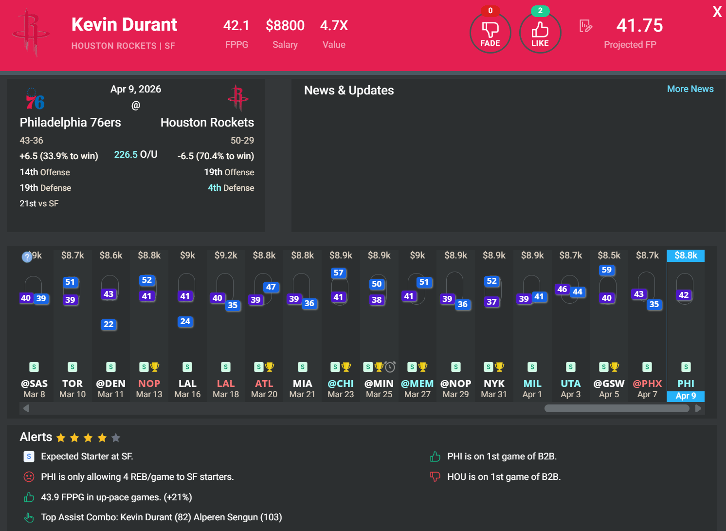 SF Kevin Durant, HOU | DK: $8.8k, FD: $9.2k | vs. PHI