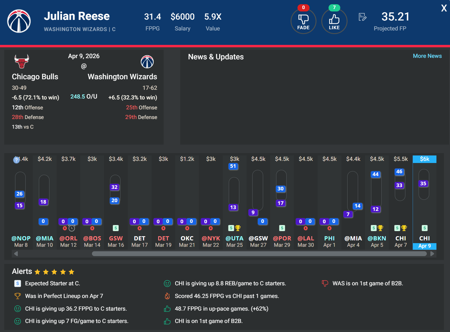 C Julian Reese, WAS | DK: $6k, FD: $6.7k | vs. CHI